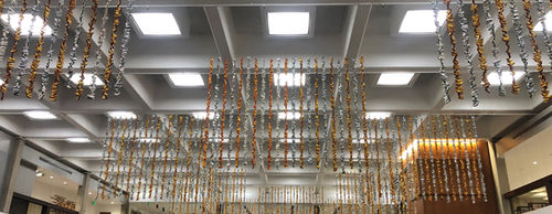“15,000 & MORE: A Plethora of Light and Darkness,” by artist Connie DK Lane, is a memorial tribute to the lives lost from the Coronavirus (COVID-19) pandemic in Los Angeles County. The concept behind this exhibit is based upon Chinese ancestral worship of deceased relatives and family members. A mixture of silver and gold ingots differentiates the deaths of males and females from the coronavirus. Best viewed from the front windows of the Library at night, each ingot within the exhibit represents a life lost to COVID-19 in Los Angeles County. It is both a beautiful and poignant reminder that while numbers of new cases are currently on the decline, daily case counts are still three times higher than they were in October 2020, and County reports have identified new strains of the virus in the community.