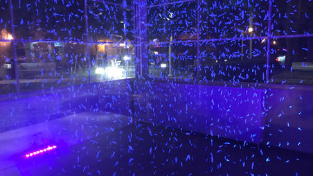 Kelly intends to involve the community by inviting them to write their dreams and wishes onto tiny pieces of paper and tucking them into the little bottles that will hang from thin wires from the ceiling. The bottles hang amongst a number of antique crystals also hanging from thin wires enveloping the suspended crib and ladder. A fan will cause a slight swaying motion of the suspended elements, the message bottles, crystal "stars", and create a subtle ripple on the draped, handmade linens. Mood lighting will tint the atmosphere and enhance the nighttime experience.