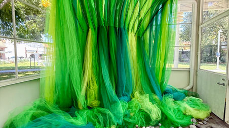 This immersive installation transforms the Adams Square Mini Park Gas Station into a living sanctuary that evolves from day to night. By day, sculptural elements - a human figure amid tree silhouettes, hanging tendrils, and biomorphic cocoons - create a physical forest microcosm inviting contemplation of our place within natural systems. The work suggests humans are complex organisms within larger ecological networks, our bodies functioning as cells in the environmental body. As twilight falls, the installation undergoes a metamorphosis. Digital projections illuminate the sculptures, transforming static forms into dynamic canvases that reveal overlooked beauty in our relationship with nature.