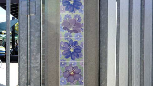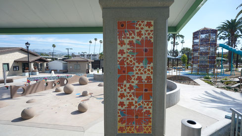 Belonging celebrates community and local landscape through an abstract vocabulary of pattern, color, and form. The artwork is featured on 22 columns throughout the park and showcases 1,164 individually designed tiles. The variety of patterns in Cara Lynch's design come together in cohesive compositions, speaking to notions of diversity, belonging, and community. Deliberate references to quilting, textile, and decoration call to mind notions of community, family, and home. The palette and flora featured in the design are inspired by regional plants that speak to ideas of belonging and place. The flowers included in Belonging are: Wishbone Bush, Beach Evening Primrose, California Aster, California Poppy, Coopers Dyssodia, and Red Catchfly.